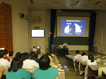 付属病院(伊勢原)から付属各病院へも同時放映システムを用いて放映され、臨床研修医は各研修病院で受講しました。