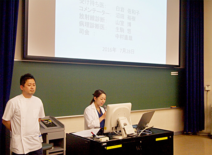 2016年度第2回となる今回は、血液腫瘍内科の白岩 佐和子先生が発表者となり「外来化学療法中にショックを呈した多発性骨髄腫の一例」との題で行われました。発表者からの症例提示後、画像診断解説、病理解説および本症例に関するコメントが各担当者それぞれからなされました。